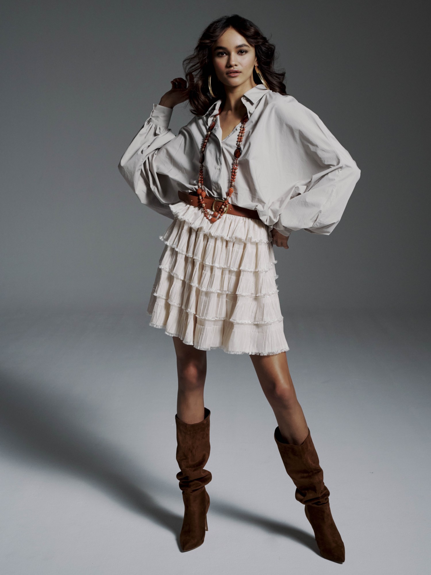 Dimitrios designs such joyful clothes - this vibrant mini skirt is certain to brighten up your wardrobe as well as lift your mood. It's made from silk chiffon in a tiered silhouette. Wear yours with the matching Blouse and sandals-