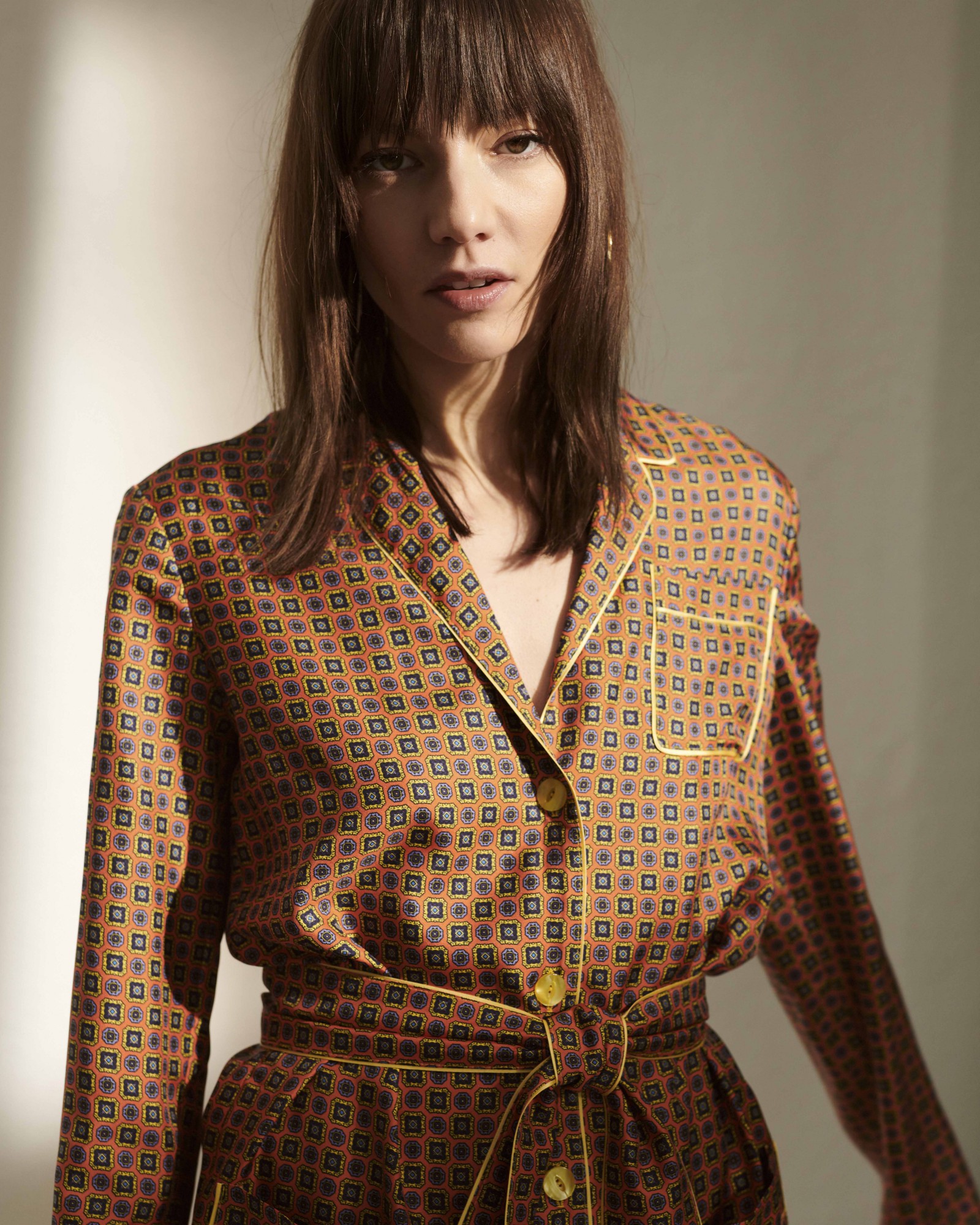 Dimitri's shirt is cut from lightweight silk dappled with a 70ies-inspired print. It's framed by a relaxed collar and traced with classic piping.