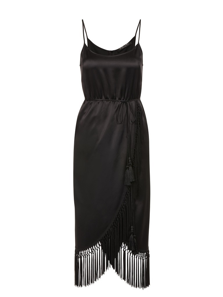 Dimitris spring collection is inspired by the 70ies. This sling dress with fringes is cut from lustrous silk and it has a subtle elasticated band that draws the eye to the slimmest part of your waist.