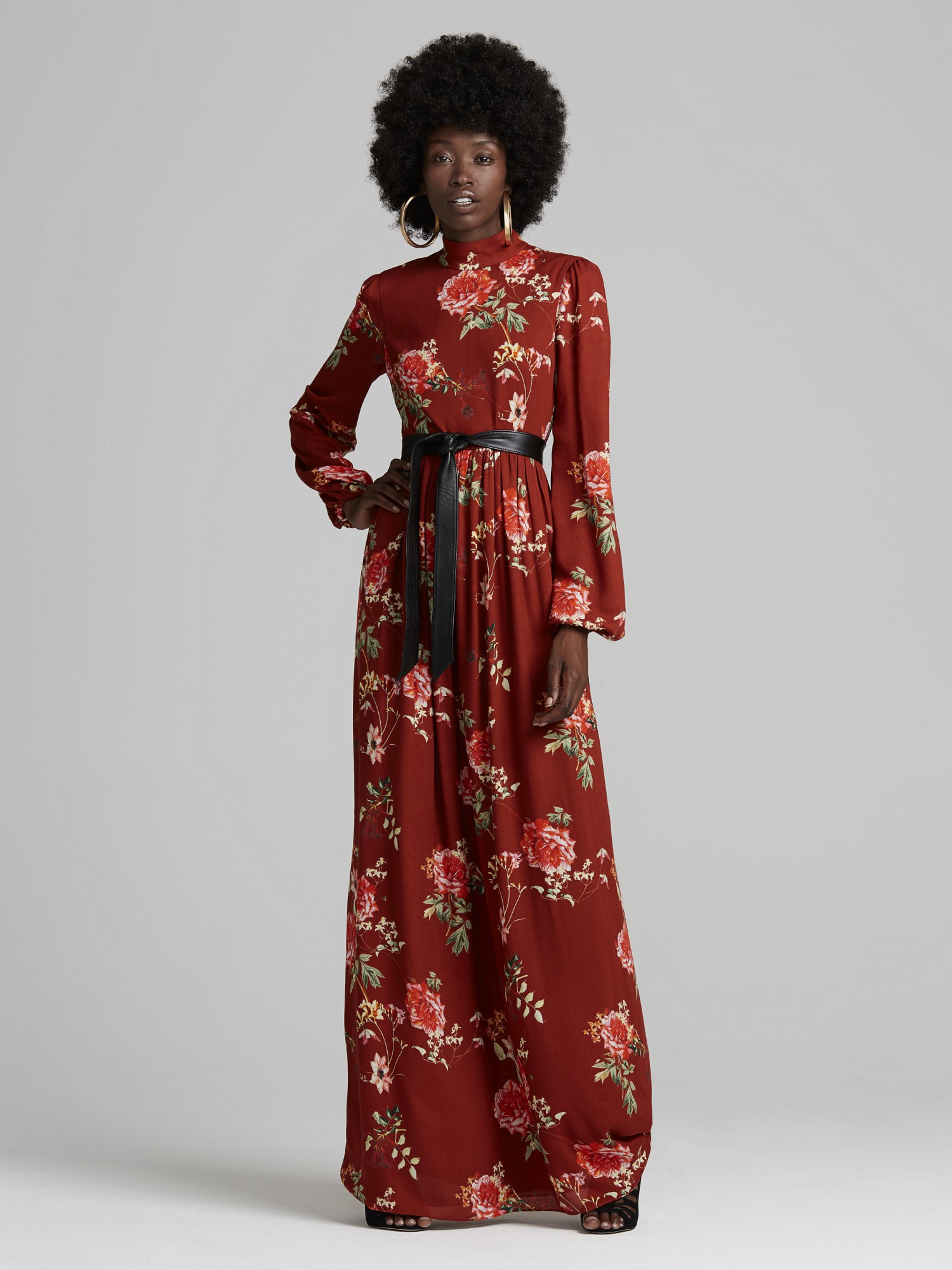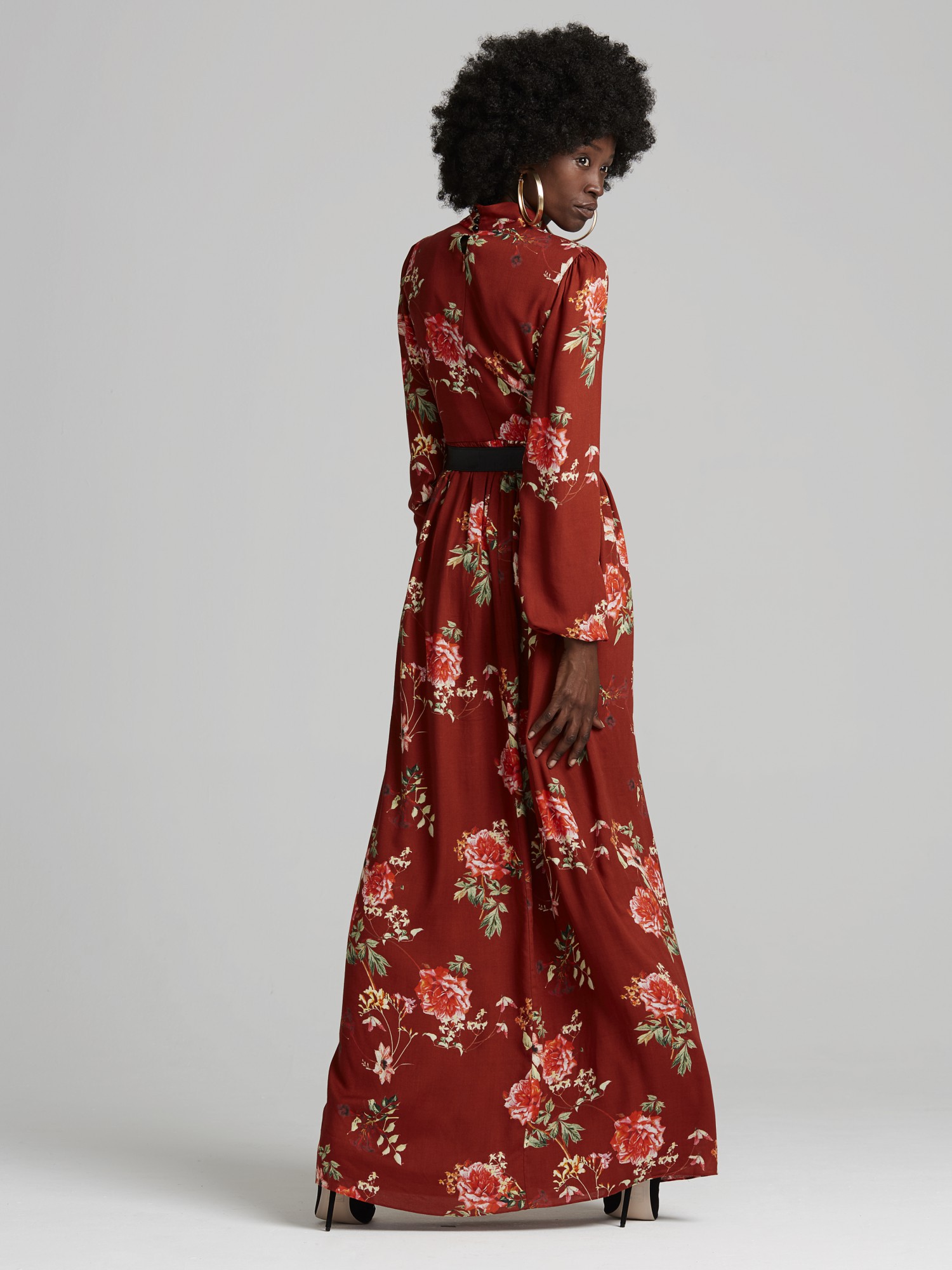 This Maxi dress with a floral motif is pleated through the skirt. Wear yours with sandals or heels.