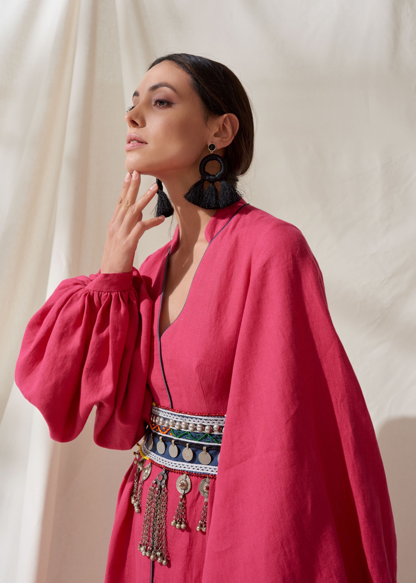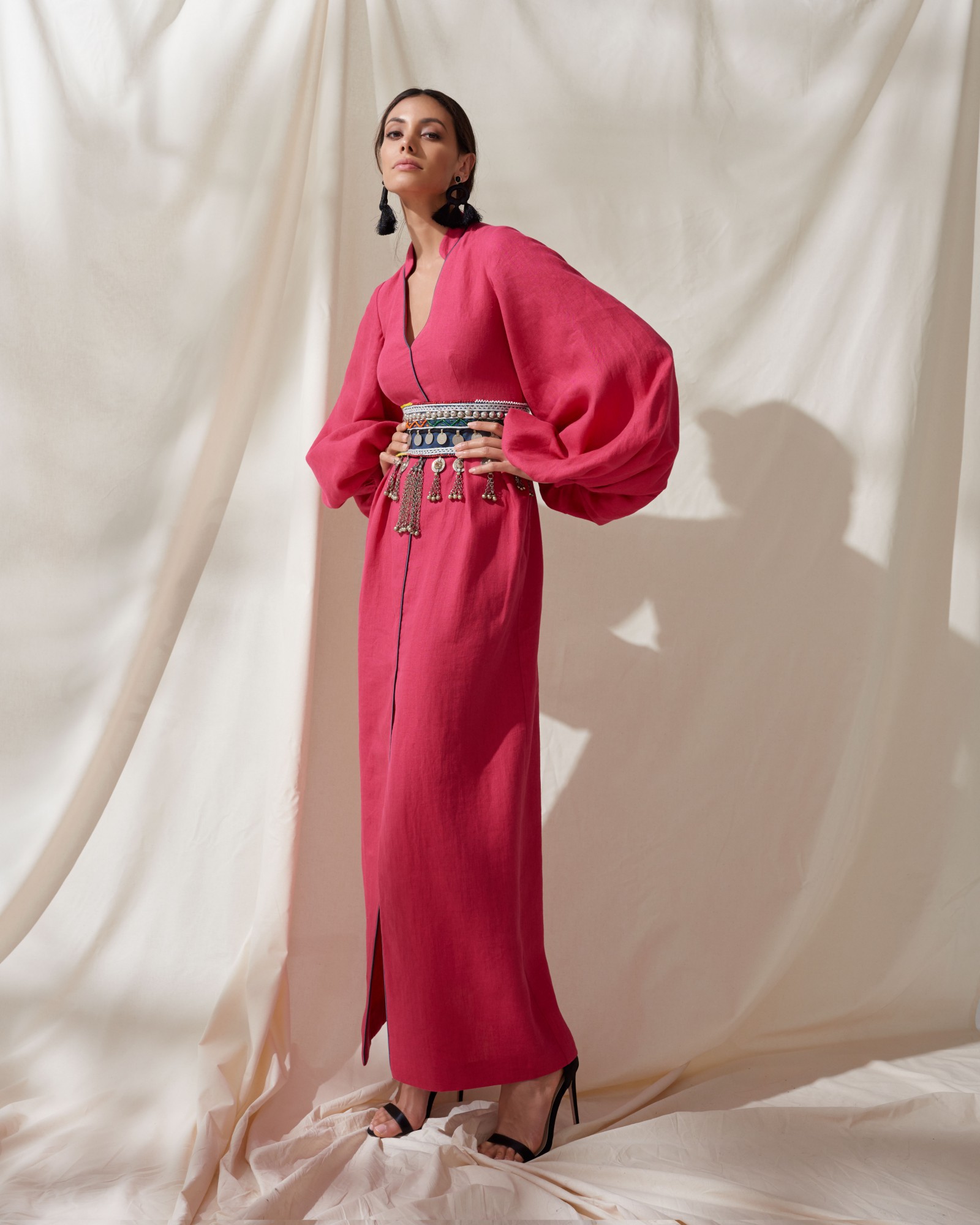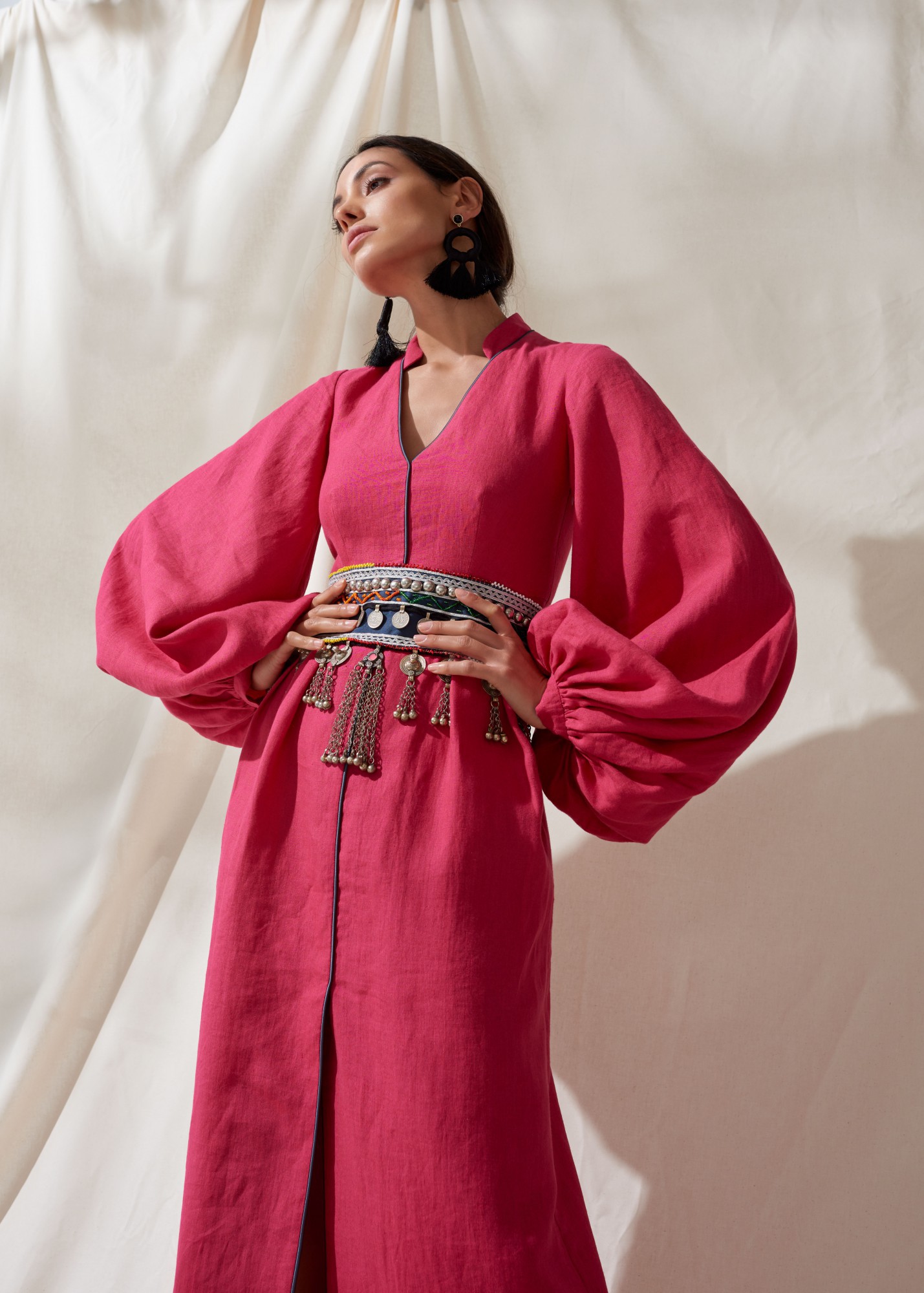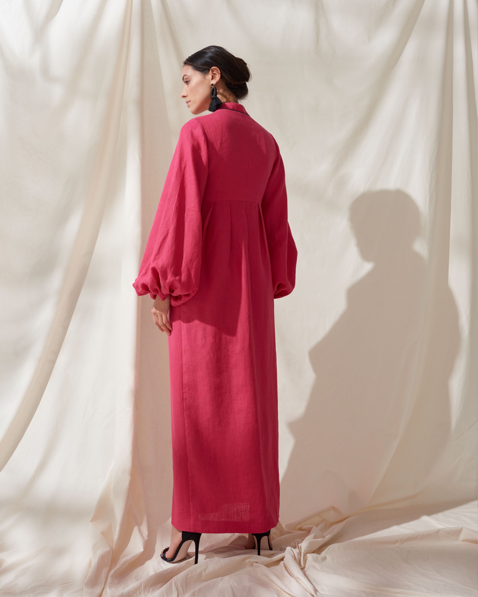 Dimitri's Linen dress is lightweight and breezy, making it perfect for vacation or warm days in the city. It has blouson sleeves and edged with silk.
