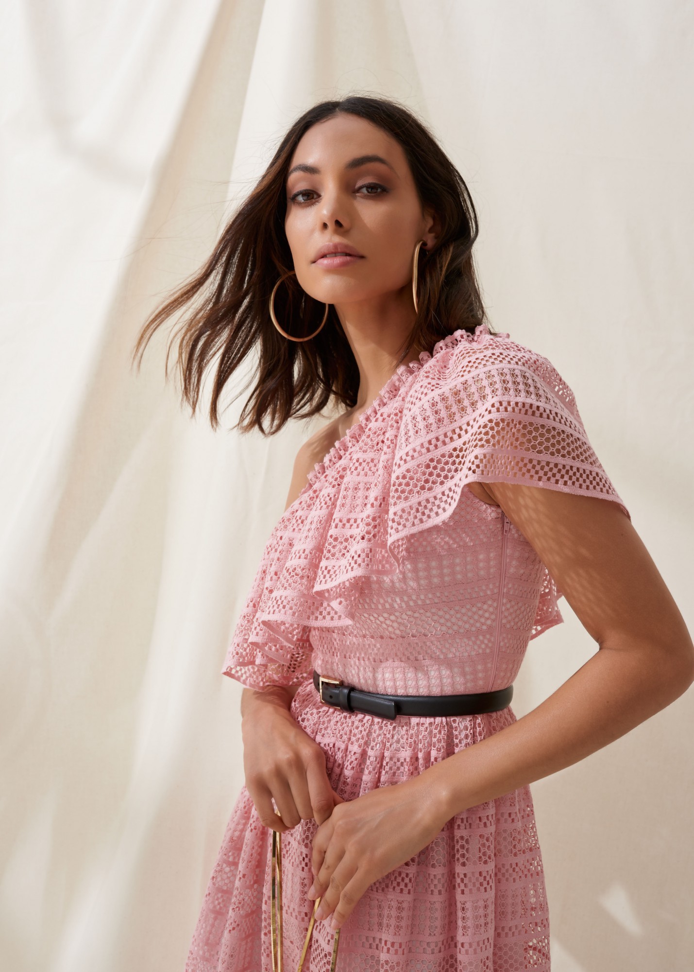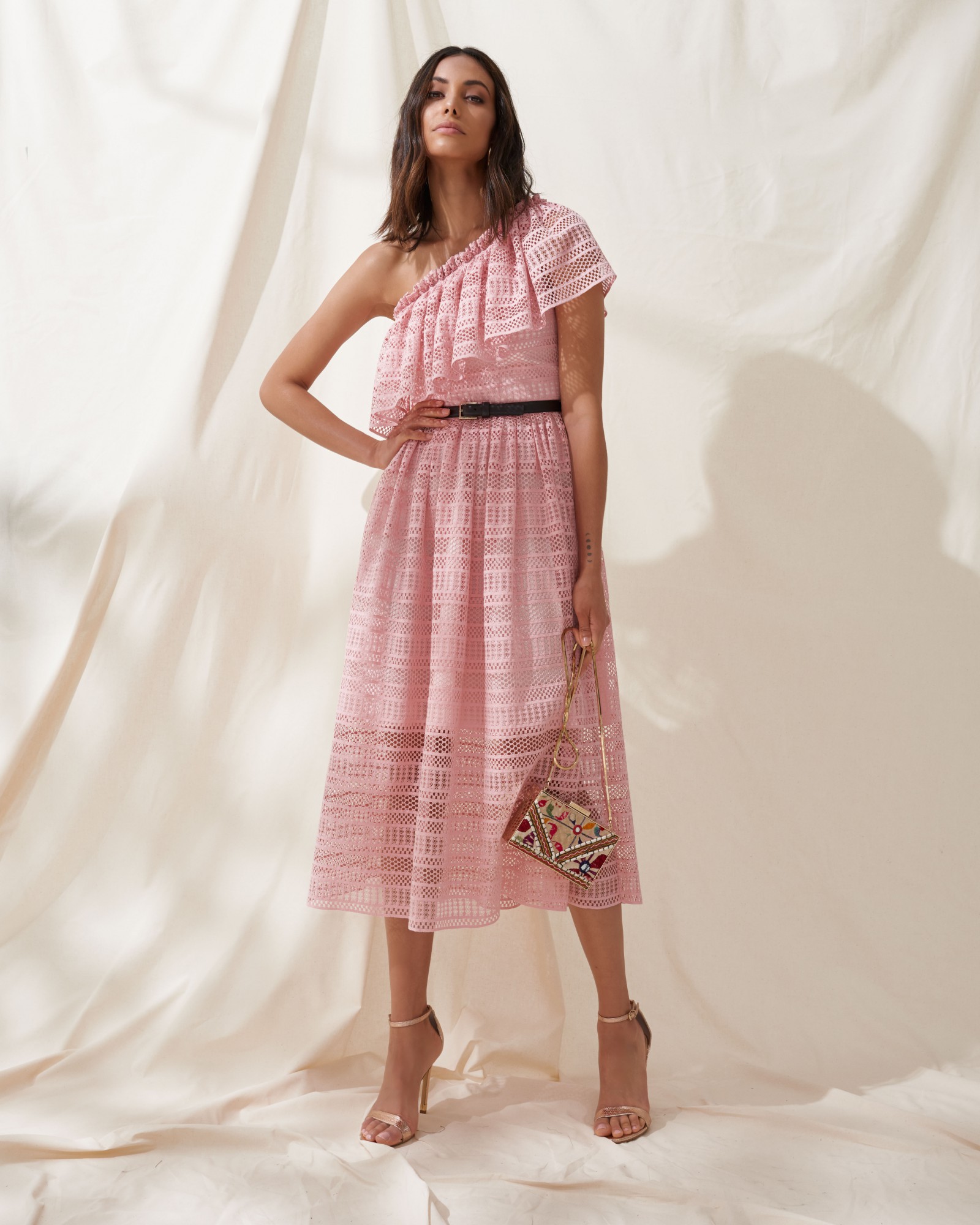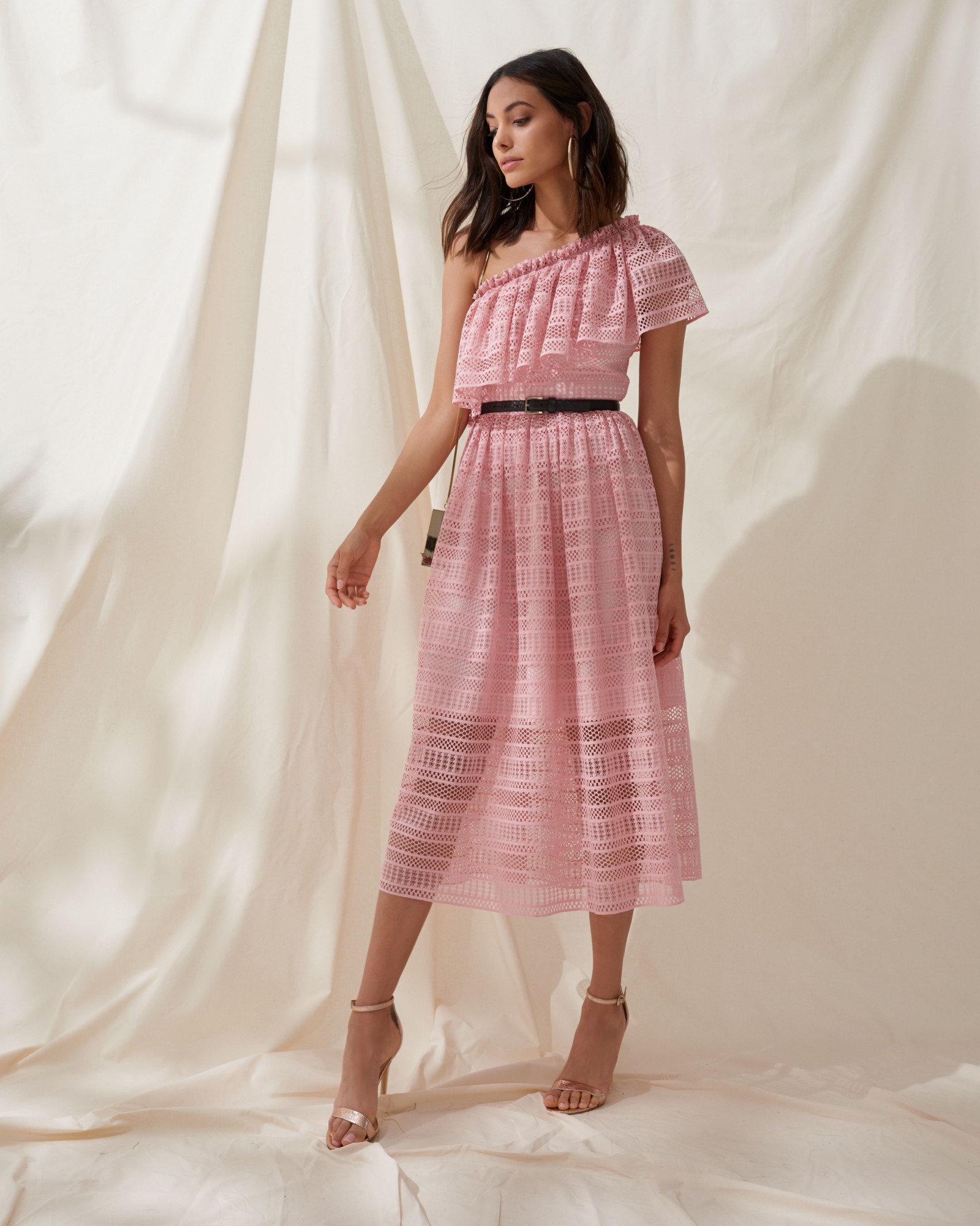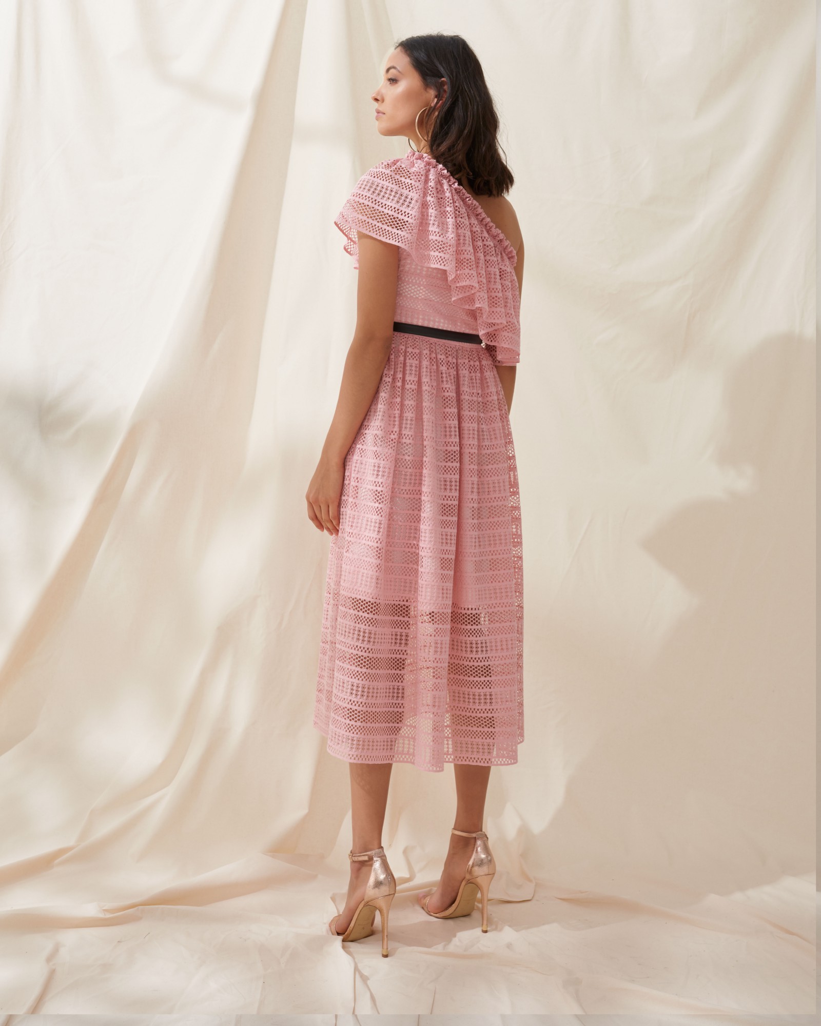 This Dimitri dress is trimmed with ruffles along the one-shoulder neckline