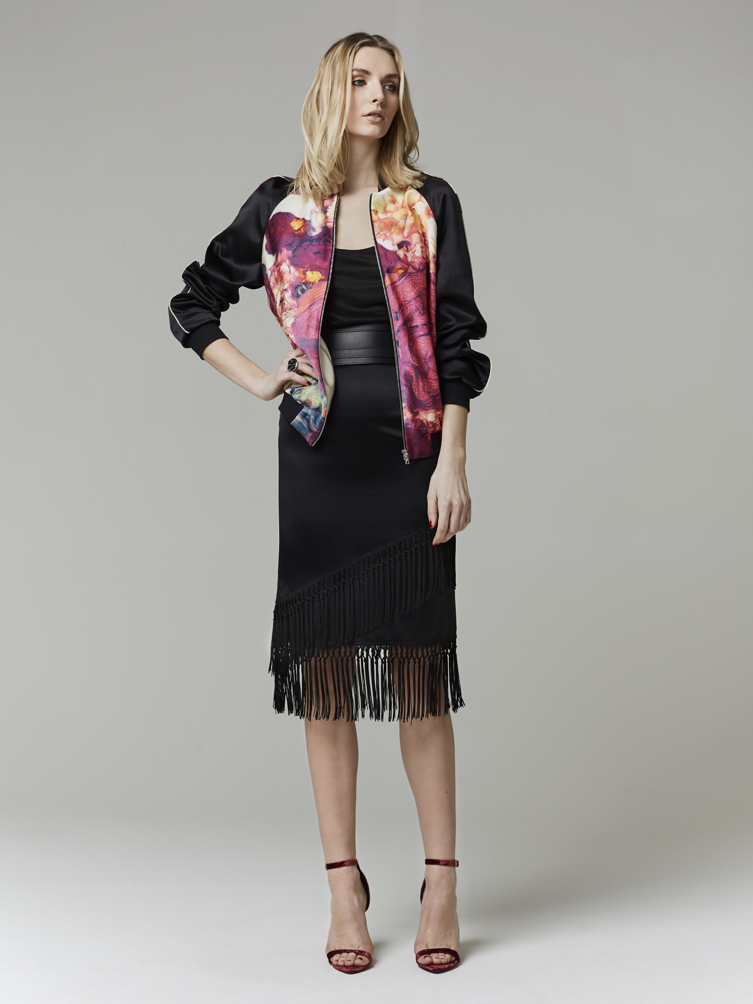 Dimitris skirt is covered with tiers of cascading fringe that moves gracefully as you walk. Designed to sit at the slimmest part of your waist.