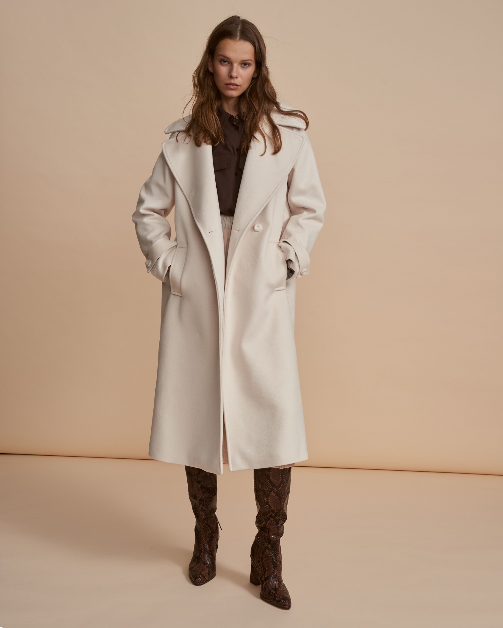 This Dimitri coat really captures the movement's striking, sharp lines. Tailored in Italy from wool-blend and cashmere for a loose shape, it has structured shoulders and detailed with traditional wide lapels, epaulettes and sleeve straps. It has a single-breasted relaxed silhouette with front pockets. A timeless style that you'll wear for years to come.