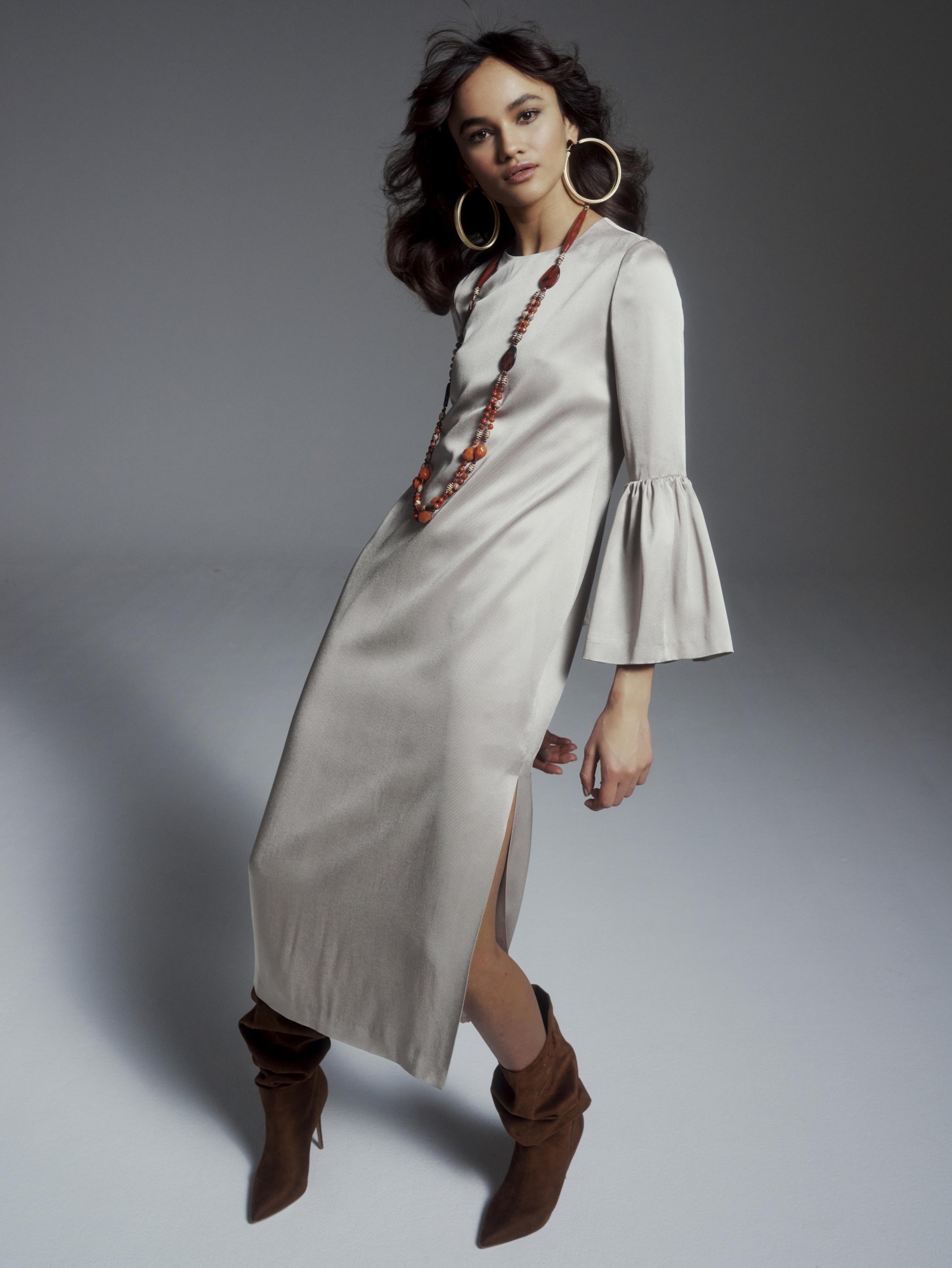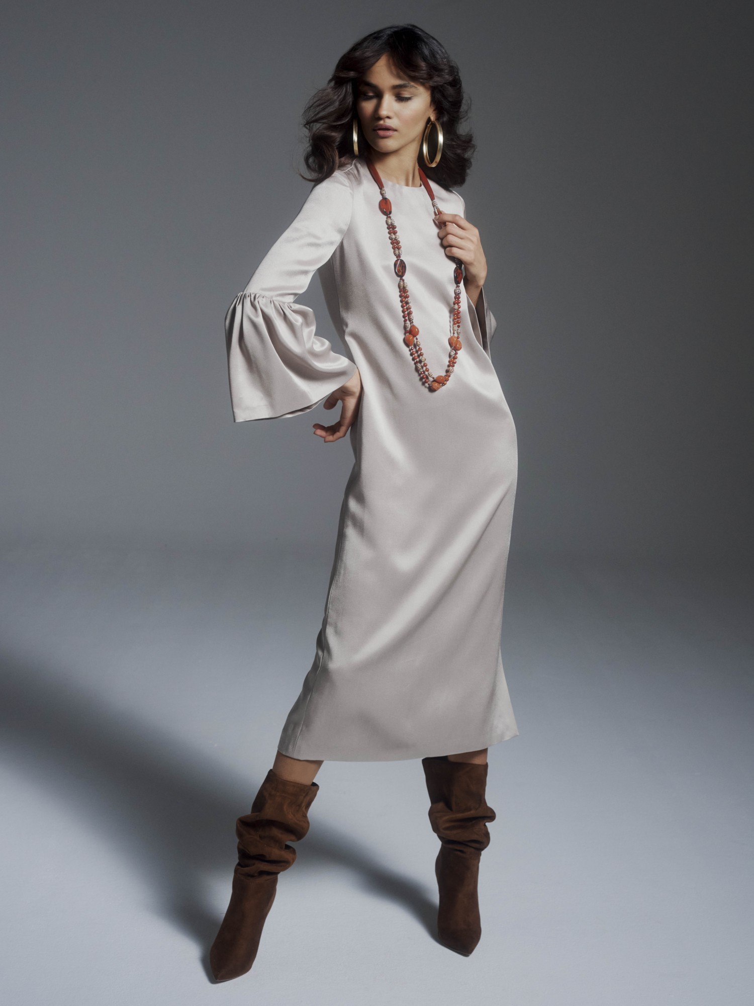 Dimitri's dress is part of the brand's Spring '21 collection, which is filled with plenty of retro influences. It's been handmade in Italy and cut from lightweight satin for a slightly loose fit. Cinch the loose fit slightly with a belt if you want.The simple, easy design of this dress allows the beautiful material and flawless craftsmanship to really shine. It has a classic boatneck, subtle side slit and ruffled sleeves.