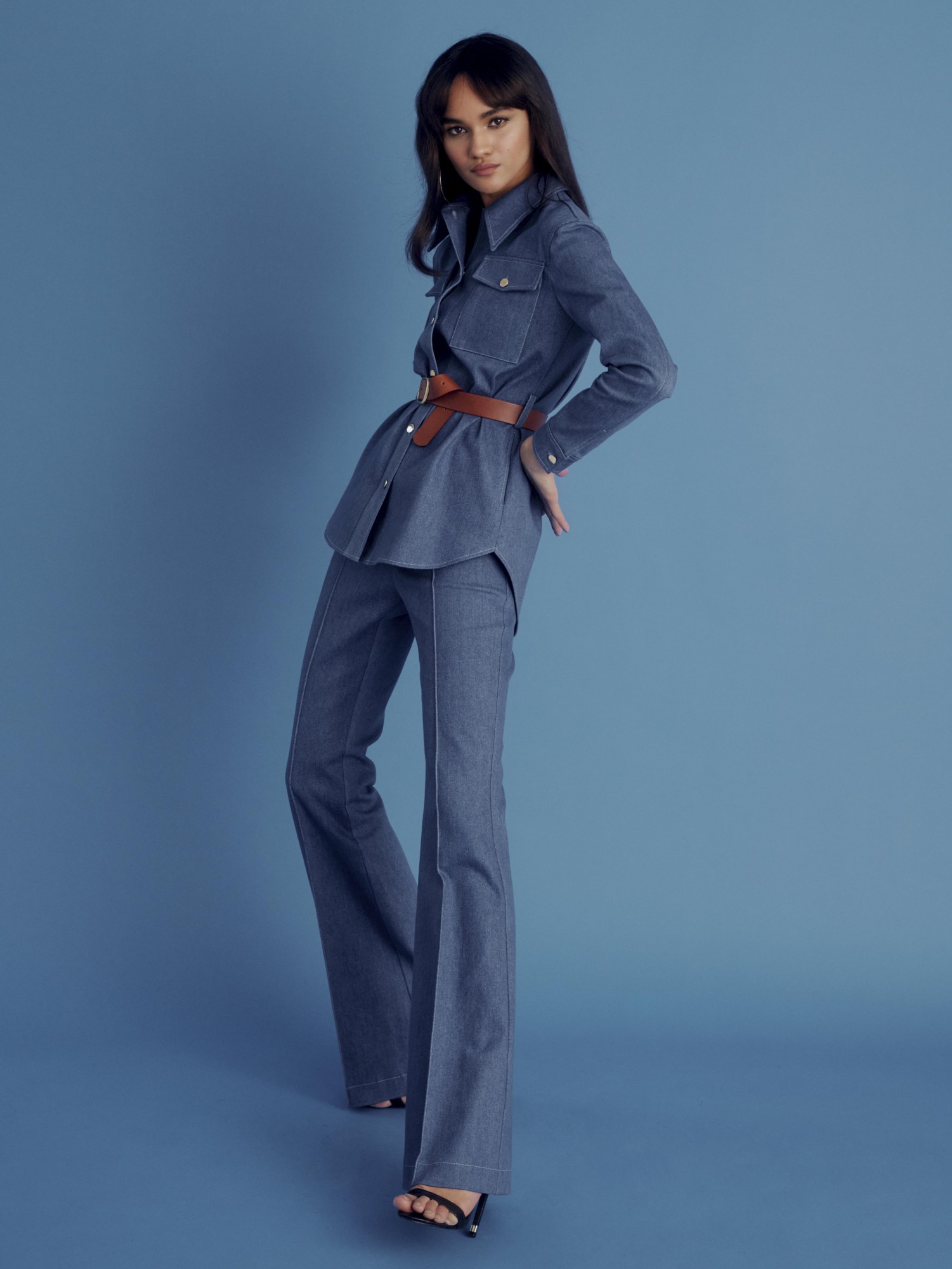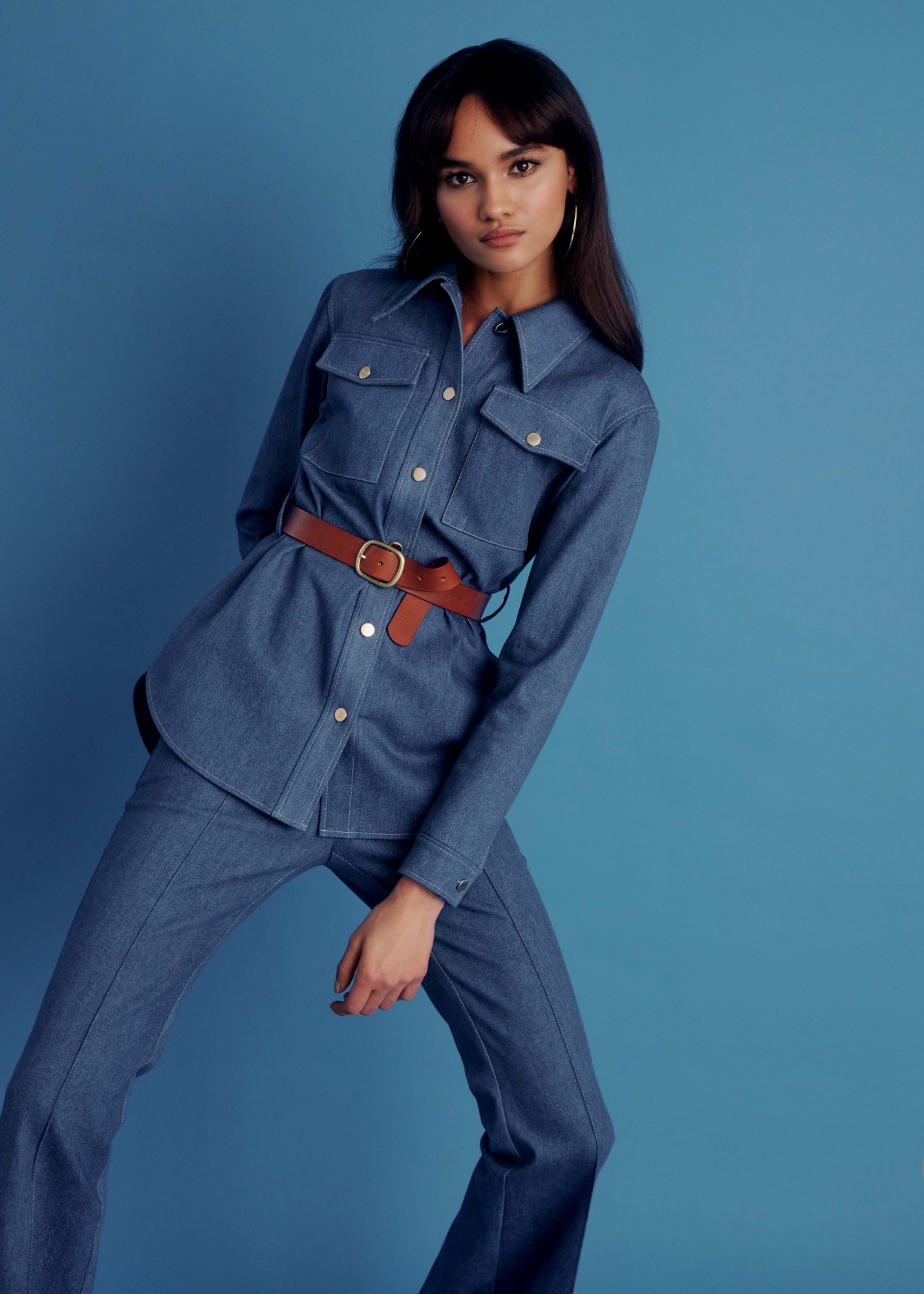 This season, Dimitri is re-imagining a number of classic pieces in Denim, and this workwear shirt is one of them. It's designed in a slightly loose silhouette and has an classic collar and flap pockets. Inspired by vintage styles, this shirt can be cinched with the tonal belt. Style yours with a denim skirt or neutral tailoring.