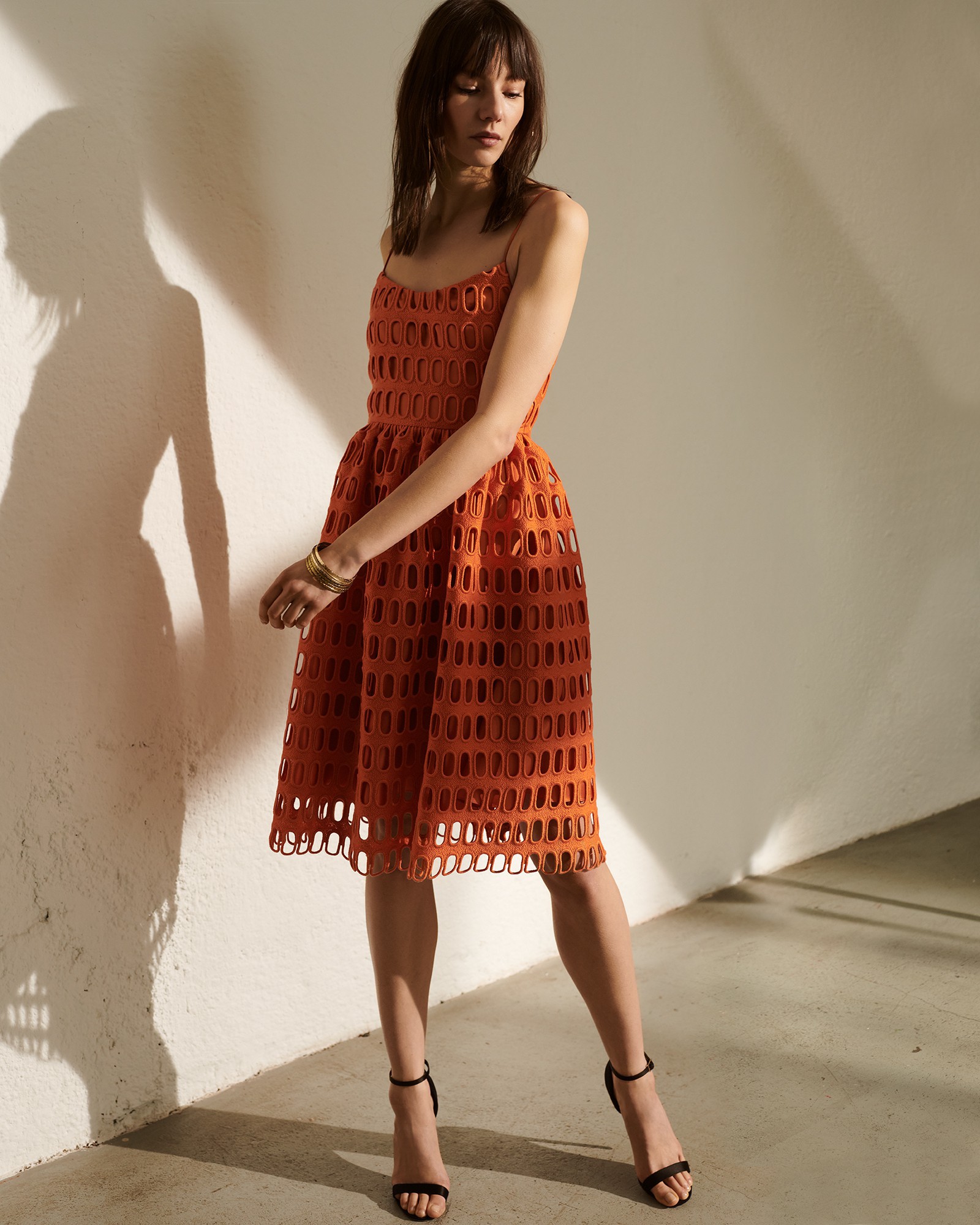 Whether you're styling Dimitri's dress for a day event like a wedding or a balmy evening on vacation. The midi dress is designed in a feminine silhouette, has clear chain straps and a '50s-inspired silhouette that gently flares from the fitted waist.