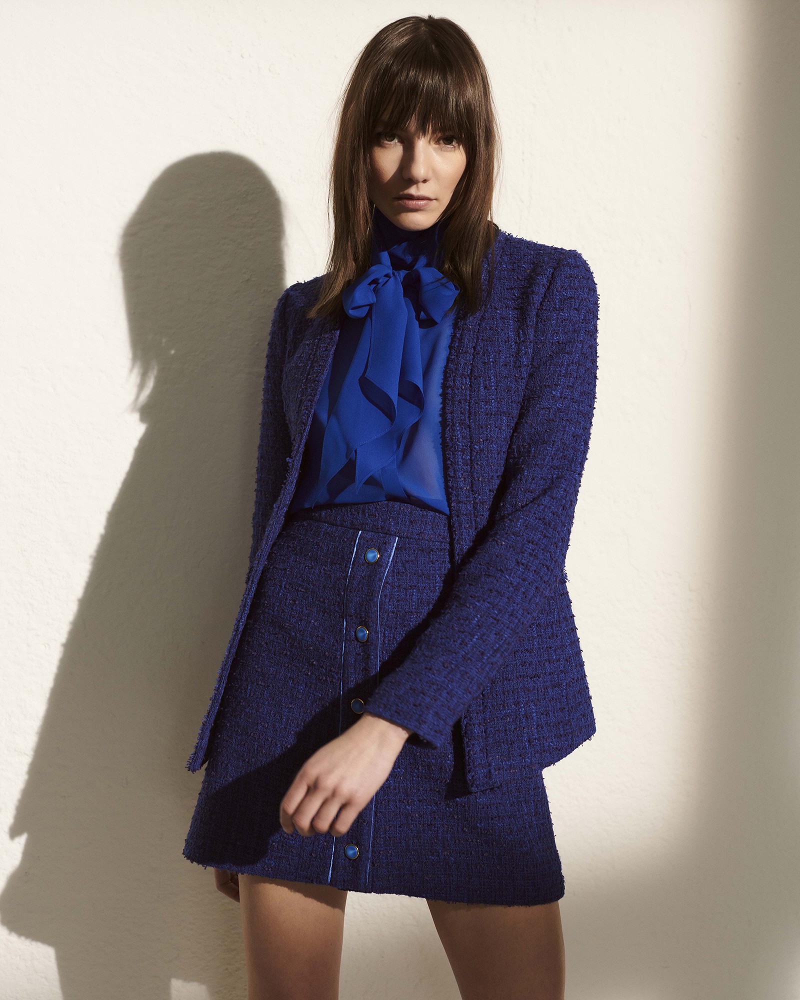 Dimitri's A-Line mini skirt is cut from tactile bouclé-tweed that's lightly frayed. As is only right for the Italian Fashionbrand, it's detailed with striking buttons and piping. Wear yours with a matching jacket and bow tie blouse.